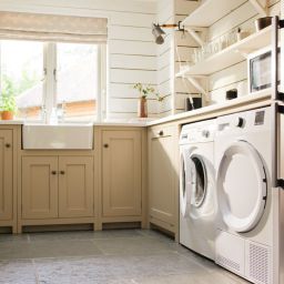 - Braune oder beige Fliesen, vorzugsweise in Holzoptik, passen hervorragend zum klassischen Landhausstil, aber auch einen mutigen Stilbruch können Sie hier wagen und auf moderne Fliesen in Betonoptik setzen.